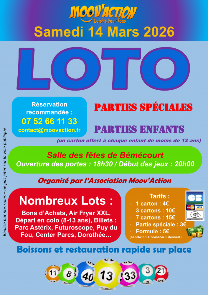 Nous vous donnons rendez-vous le samedi 14 mars pour notre grand loto à la Salle des Fêtes de Bémécourt !