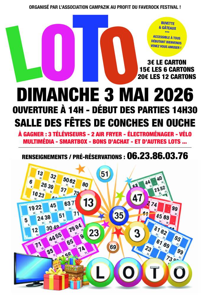 Loto organisé en faveur du Faverock Festival - nombreux lots dont 3 téléviseurs, 2 Air Fryers, 1 vélo, 1 Smartbox, électroménager, multimédia, bons d'achat...