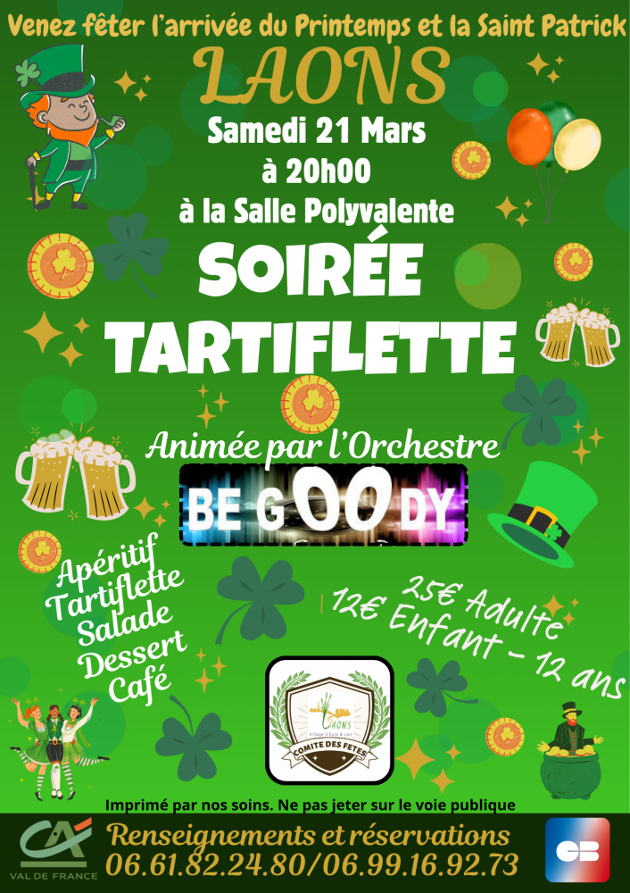Venez fêter l'arrivée du printemps et la Saint Patrick autour d'une bonne tartiflette « maison » et au son de l'orchestre « BEE GOODY »
